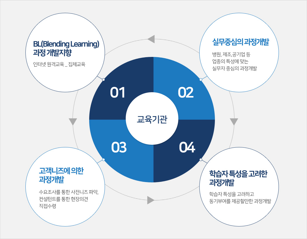 BL(Blended Learning), 실무중심, 고객니즈, 학습자 특성을 고려하여 과정을 개발하고 있습니다.